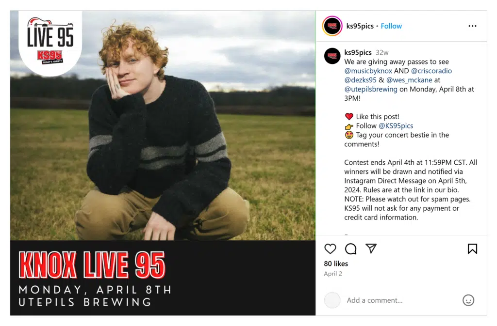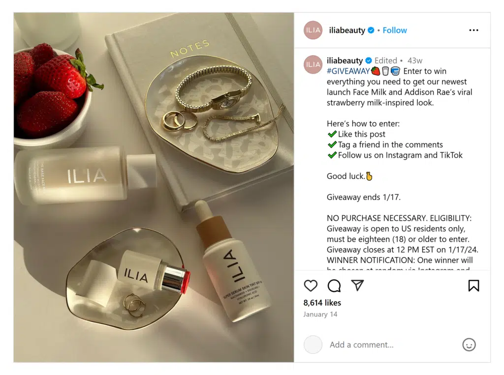 Users need to follow both accounts, tag two friends, and like and comment on the post to enter. This helps generate buzz for the giveaway and helps each brand grow its following.